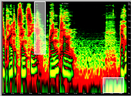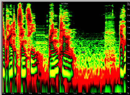 Dafür benutzen wir die sog. Audio-Retouch-Tools: In der Darstellung links sieht man 10 Sekunden eines Musikstückes (x-Achse), die Frequenz ist auf der y-Achse abzulesen. Zusätzlich gibt die Farbabstufung von rot über grün bis gelb Auskunft über die Intensität des Schallereignisses. Dies hat den Vorteil, Störungen wesentlich besser als in der Amplitudendarstellung erkennen und lokalisieren zu können.